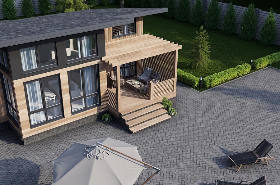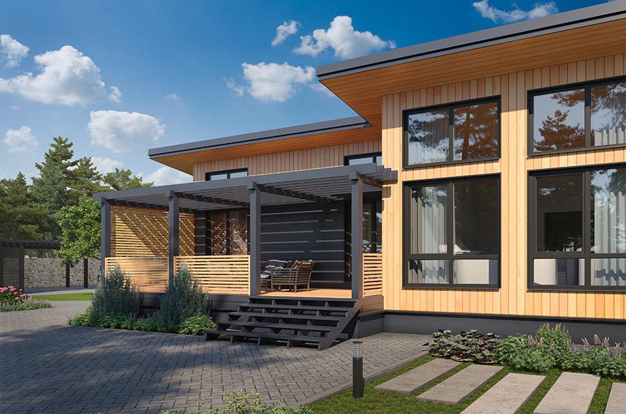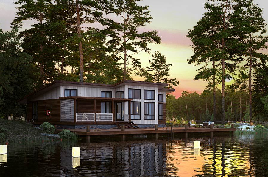 Одноэтажные коттеджи серии «Акварель» максимально функциональны: широкая плоская кровля, прямые линии и удобные планировки.