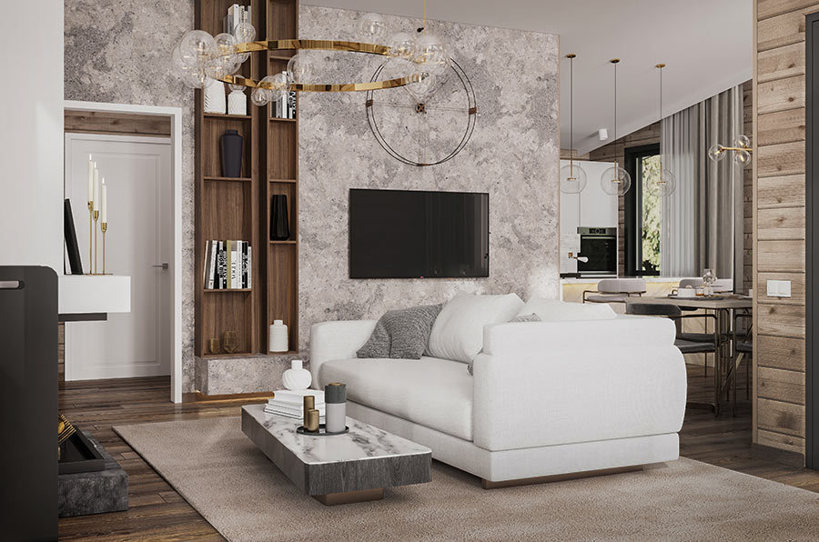 Гостиная Г-образной формы находится в одном пространстве со светлой кухней. В зависимости от проекта, в коттеджах от двух до четырёх изолированных комнат, которые можно использовать под спальни, рабочий кабинет, детскую. В базовую комплектацию входит пергола и техническое помещение.