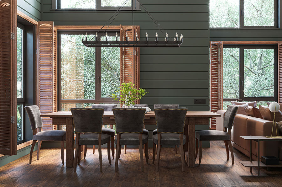 Стулья в тканевой обивке и древесно-зелёная палитра добавляют интерьеру благородной роскоши. А панорамные окна и второй свет делают столовую максимально просторной.