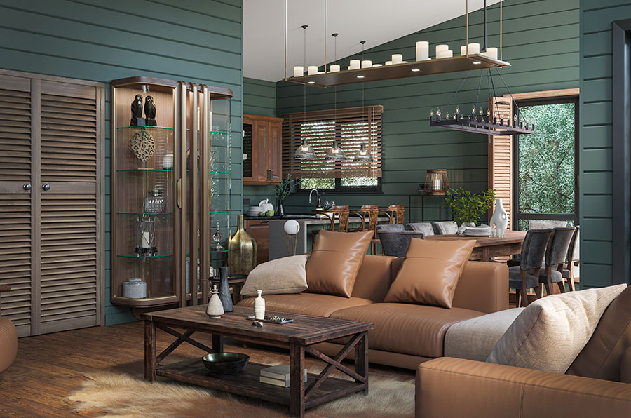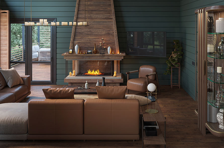 Благородные изумрудные тона отделки гармонично сочетаются с натуральным деревом и бежевой мебелью. Камин, главный акцент гостиной, делает её уютнее.