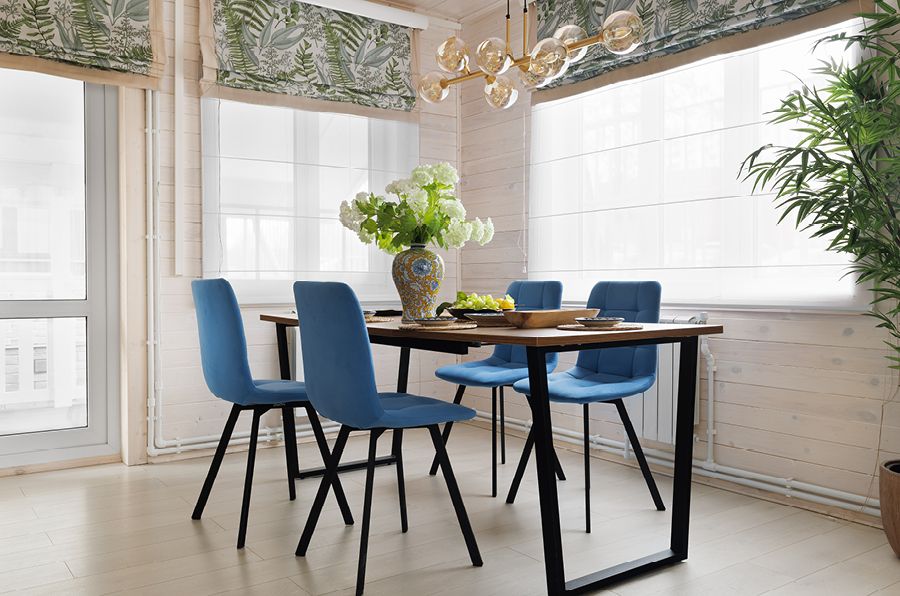 На кухне предусмотрено место для обеденной зоны. Благодаря большим окнам пространство столовой хорошо освещается с улицы. В качестве ярких акцентов здесь можно использовать растительные узоры и цветы.