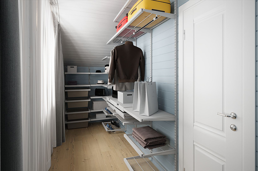 В планировке предусмотрены две гардеробные. Самая просторная — гардеробная второго этажа (10,5 кв. метра). В ней можно организовать удобное хранение вещей каждого члена семьи.