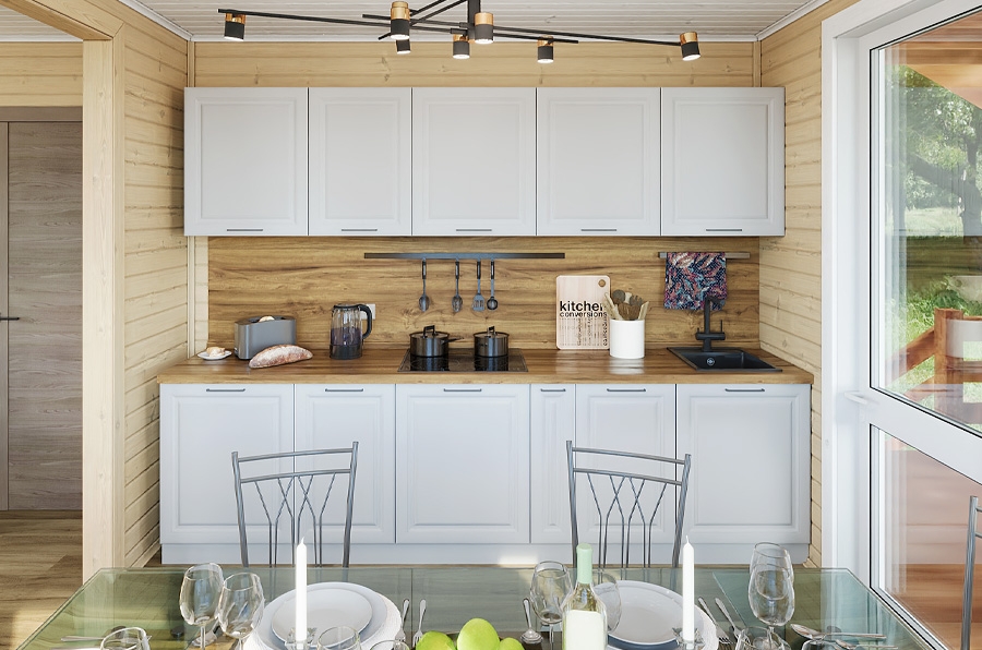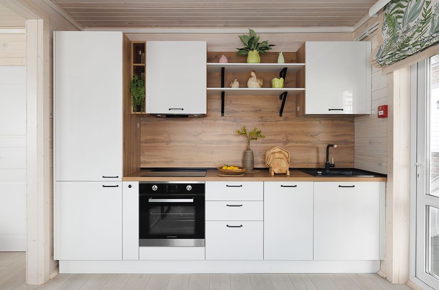 Белые матовые фасады с классической фрезеровкой гармонично сочетаются с деревянной отделкой и придают интерьеру современный облик. Гарнитур может быть прямым или Г-образным в зависимости от планировки помещения.