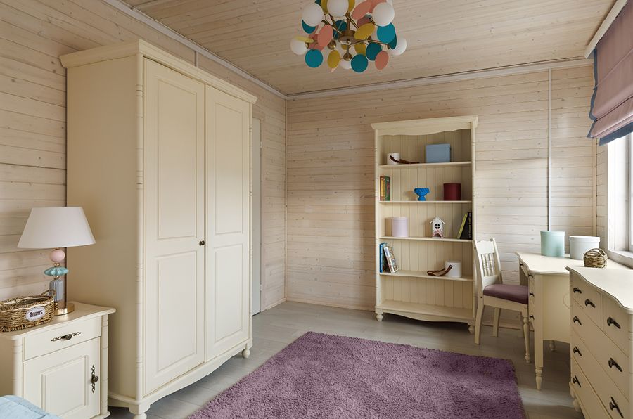 В просторной детской достаточно места и для учебной зоны, и для гардеробного шкафа. Яркие акценты в виде коврика, шторы и разноцветной люстры помогают разнообразить интерьер, при этом не перенасыщают его пёстрыми красками.