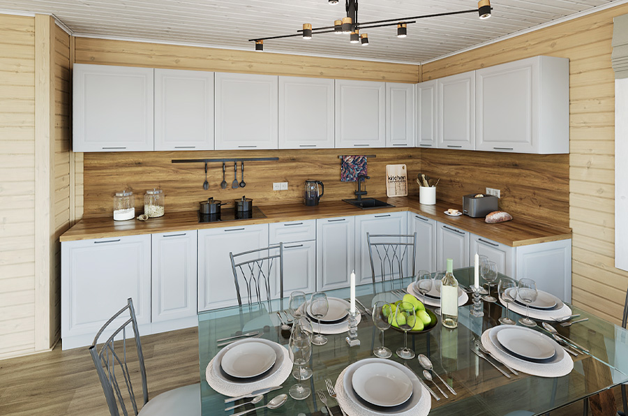 Белые матовые фасады с классической фрезеровкой гармонично сочетаются с деревянной отделкой и придают интерьеру современный облик. Гарнитур может быть прямым или Г-образным в зависимости от планировки помещения.