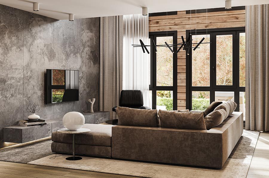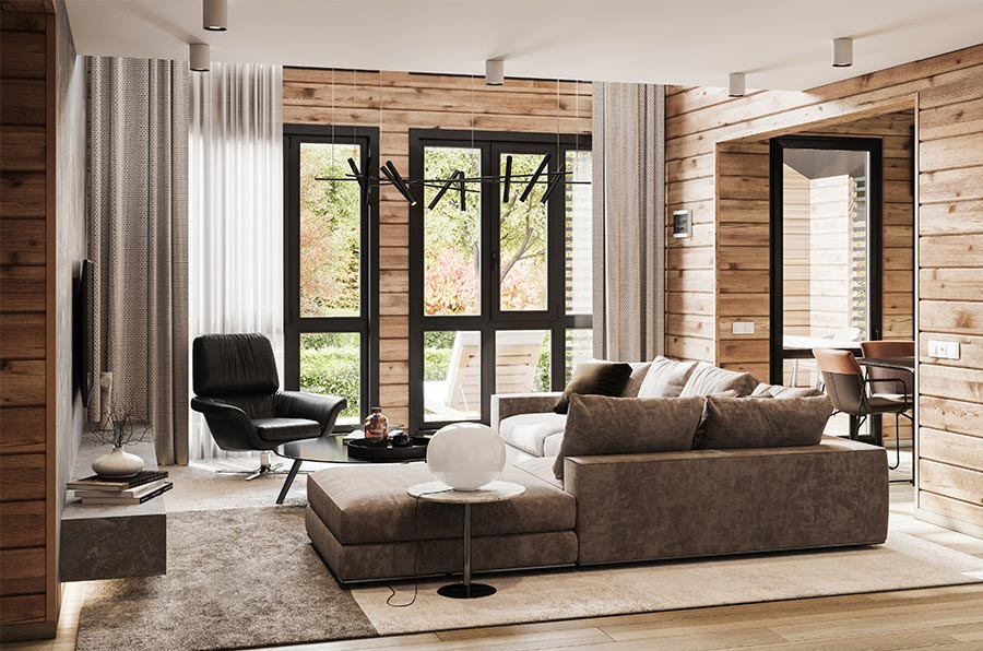 Гостиная с панорамным окнами и вторым светом впечатляет объёмом и высотой потолков. Широкий арочный проём разделяет зоны гостиной и кухни-столовой.