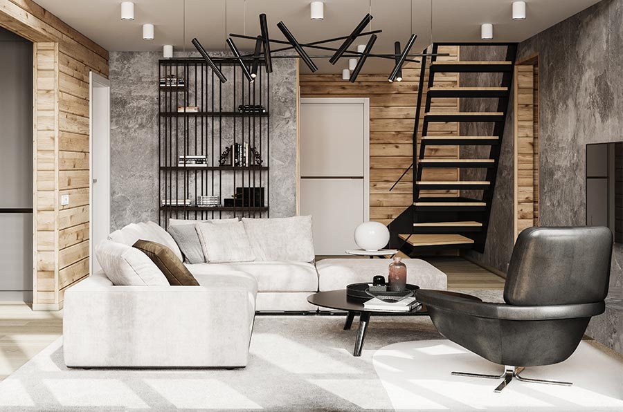 Светлая гостиная образует единое пространство с холлом, из которого на второй этаж ведёт изящная лестница открытого типа с забежными ступенями.