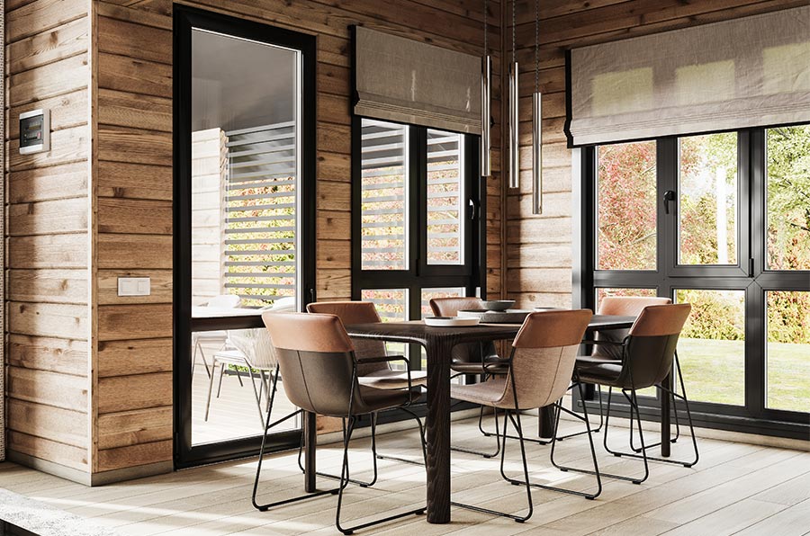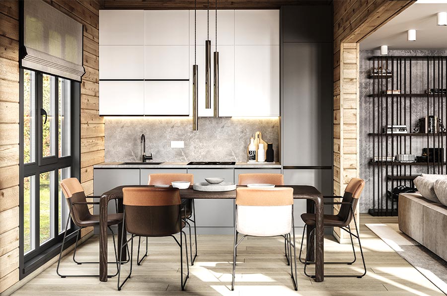 Просторная и функциональная кухня наполнена светом, льющимся из панорамных окон. Серо-белый гарнитур контрастирует с деревянными стенами и делает интерьер более многогранным.