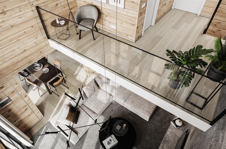 Благодаря второму свету холл со стеклянным ограждением выполняет функцию внутреннего балкона. Это архитектурное решение, доступное уже в базовом варианте проекта, наполняет дом светом и воздухом, а интерьерам добавляет изящности и лёгкости.