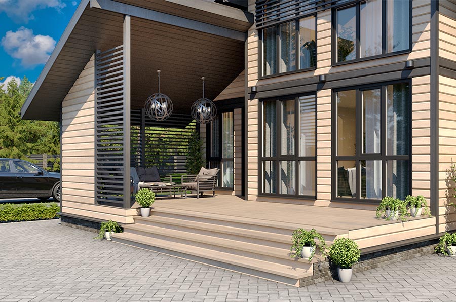 Уютная терраса с широким подиумом в стиле патио — полезное и эстетичное дополнение к проекту дома.