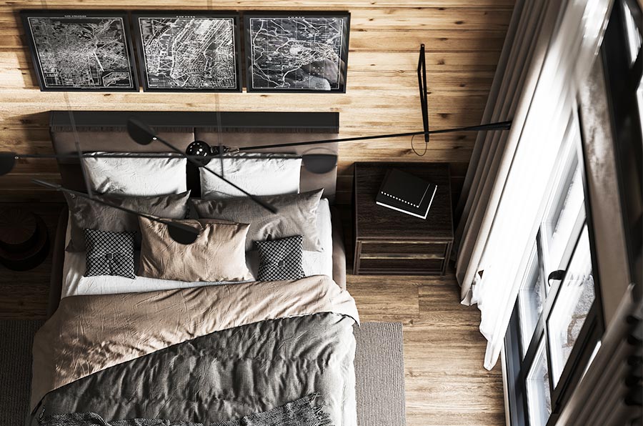 Использование разных древесных оттенков делает интерьер спальни динамичнее, а палитру — глубже. При этом комната лишена пёстрых деталей: ничто не мешает спокойному отдыху. Все три спальни первого этажа оборудованы вторым светом.